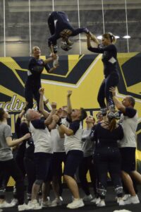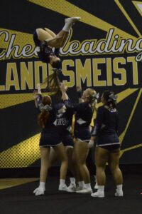 Den ersten Meisterschaftstag beendeten die Blue Devils Groupie Team (Kategorie Master Mixed Cheer). Das ursprünglich von Eltern der aktiven Cheerleader gegründete Team erfreut sich mittlerweile auch an externen Mitglieder:innen, die ihre Leidenschaft für den Sport entdeckt haben. Die Frauen und Männer zwischen 30 und 60 Jahren steigerten den Anspruch ihrer Routine im Vergleich zum Vorjahr erneut und beeindruckten nicht nur die Jury, sondern den gesamten heidelberger SNP-Dome. Für den 1. Platz hat es in diesem Jahr zwar leider nicht gereicht, doch blickt das gestärkte Team mit Stolz auf eine Steigerung um knapp 30 Punkte seit der letzten Meisterschaft. Dies ist nicht nur der Verdienst der Athlet:innen selbst, sondern vor allem auch den engagierten Trainerinnen Sarah Haberbosch, Stella Seyfang und Sarah Träutlein zu verdanken.